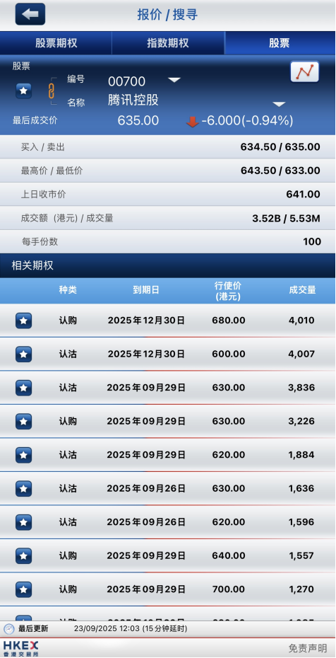 騰訊控股早盤跌0.94%,期權方面:騰訊控股440港元的認沽期權漲幅最高達12300%,12月30日到期行權價680港元的認購期權成交量居前,成交4010張合約。
