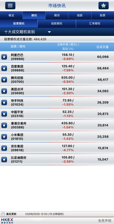 截止午間收盤,港股期權半日成交48.4萬張,其中,阿里巴巴成交量居前,期權成交6萬張;百度集團位居次席,期權成交5.8萬張;騰訊控股名列第三,期權成交4.8萬張。