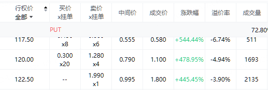 百度集團早盤大跌超7%,期權方面:今日百度半日期權成交量較昨日上漲60%達5.8萬張,百度集團多張9月26日到期行權價117.5-122.5港元的認沽期權最低漲超440%。