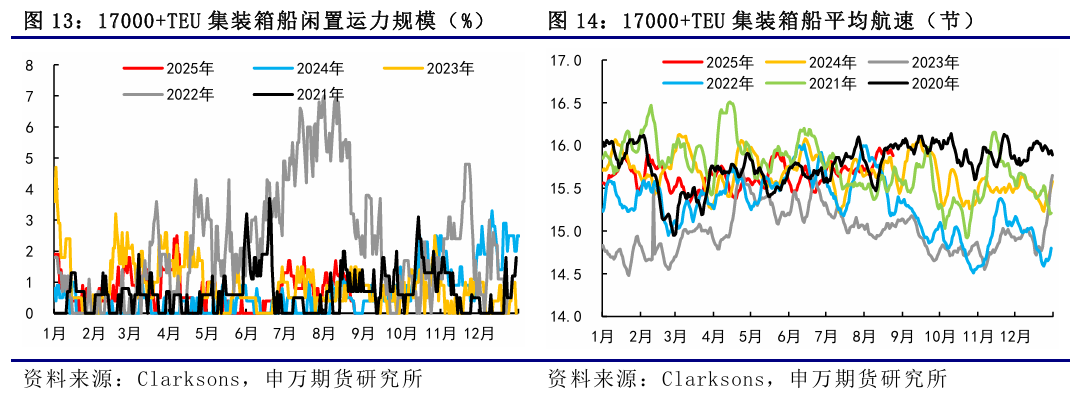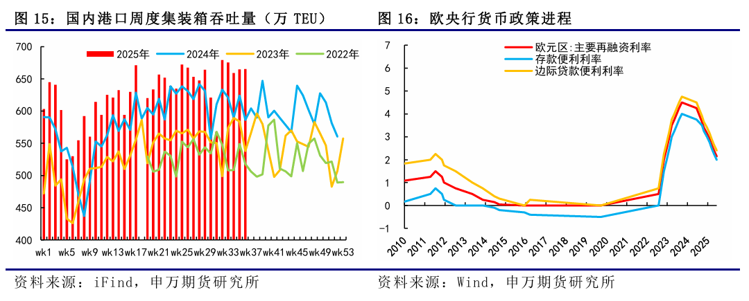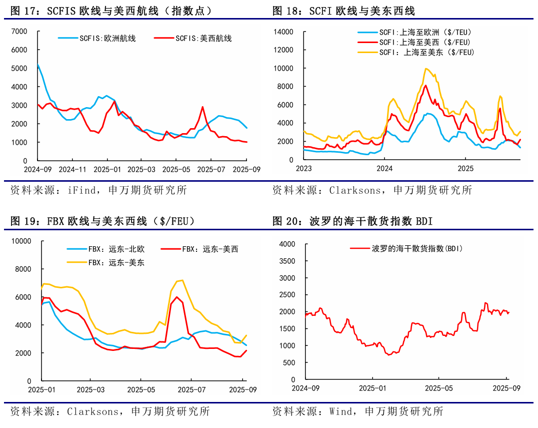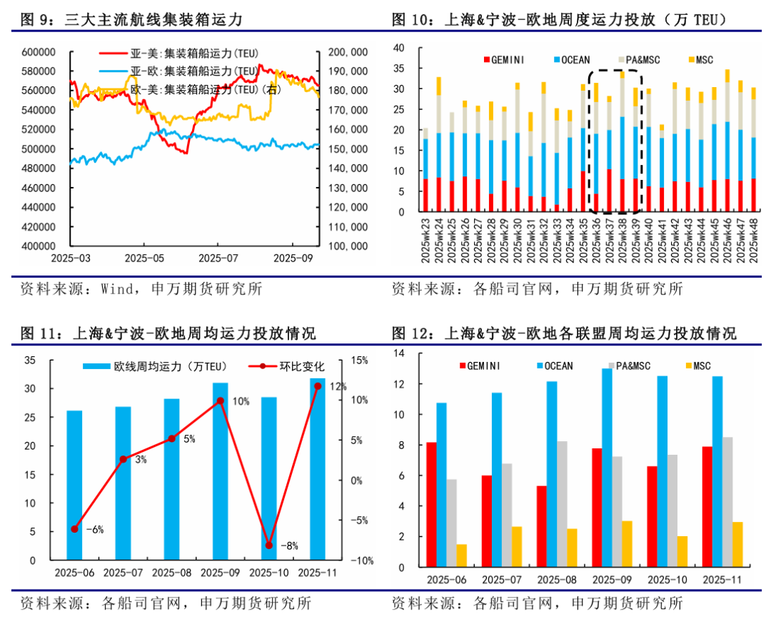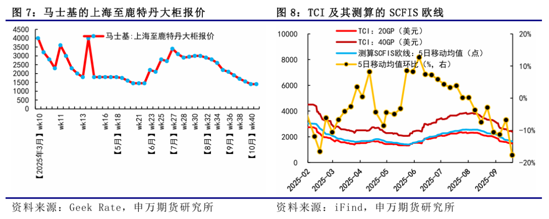 9月15日當週,EC繼續弱勢運行,市場價格中樞再度下一臺階,週五主力10合約跌破1100點整數關口,主因在於國慶黃金週前現貨運價的加速下行,盤面跟隨現貨運價。週二馬士基開艙第40周,大櫃報價1400美元,環比下調150美元,周度環比降幅與此前持平,但PA和OA聯盟的跟降加速使得市場對於9月底的運價預期持續走弱。12合約來看,美聯儲降息25個基點落地,帶動短期12合約跟隨商品情緒略有走弱,12-10價差向上動能有所弱化。9月22日最新公佈的SCFIS歐線爲1254.92點,對應於09.15-09.21期間的離港結算價,較上期下跌12.9%,連續第10周下跌,對應大櫃運價爲1880美元左右,主要反映9月第三週OA聯盟和PA聯盟的加速跟降。後市來看,9月底船司降價博弈趨於白熱化下,現貨運價加速下行,期貨跟隨現貨。目前船司9月底大櫃均價在1500美元左右,折算成現貨指數基本和10合約持平,馬士基當前報價已低於5月份報價,爲年內新低同時也是2023年底繞行好望角以來新低,國慶前運價繼續加速下行。目前統計到10月周均運力降至28萬TEU左右,運力相對有所下降,國慶黃金週後運價下行速率或有放緩,關注後續船司調降節奏。1、貨量表現超預期;2、船司運力調控力度超預期;3、關稅政策對海運供需的不確定性影響。9月15日當週,EC繼續弱勢運行,市場價格中樞再度下一臺階,週五主力10合約跌破1100點整數關口,主因在於國慶黃金週前現貨運價的加速下行,盤面跟隨現貨運價。週二馬士基開艙第40周,大櫃報價1400美元,環比下調150美元,周度環比降幅與此前持平,但PA和OA聯盟的跟降加速使得市場對於9月底的運價預期持續走弱。12合約來看,美聯儲降息25個基點落地,帶動短期12合約跟隨商品情緒略有走弱,12-10價差向上動能有所弱化。9月22日最新公佈的SCFIS歐線爲1254.92點,對應於09.15-09.21期間的離港結算價,較上期下跌12.9%,連續第10周下跌,對應大櫃運價爲1880美元左右,主要反映9月第三週OA聯盟和PA聯盟的加速跟降。從SCFI歐線的走勢來看,今年歐線夏季旺季運價在7月初見頂,之後進入平頂狀態,8月初開始回落,8月底9月初開始加速下降,進入9月下半月後運價開始第二輪加速下降。上週五盤後公佈的SCFI歐線爲1052美元/TEU,基本對應於09.22-09.28期間的歐線訂艙價,周度環比下跌102美元,較上週絕對跌幅有所收窄,反映9月最後一週運價的續降。SCFI美線方面,美西和美東航線挺價失敗,運價大幅回調,美西由2370美元/FEU降至1636美元/FEU,環比下降30.97%,美東由3307美元/FEU降至2557美元/FEU,環比下降22.68%。從船司報價來看,GEMINI聯盟中,週二MSK開艙第40周,大櫃報價1400美元,環比下調150美元,周度環比降幅同第39周持平,週三新開艙第41周,大櫃報價1400美元,這兩週處於國慶中秋長假期間,貨量減少兩週報價維持一致,HPL至10月上半月大櫃報價維持1535美元。OA聯盟中,OOCL率先跟降,當前至10月上半月大櫃降至1450-1500美元,CMA微降至大櫃1620美元,EMC在10月1日開艙大櫃報價1500美元,其餘10月上半月大櫃微降至1610美元。PA聯盟中,YML跟降迅速,ONE降至大櫃1435美元。MSC則當前在9月下半月至10月上半月均維持大櫃1590美元。更高頻的北方國際集裝箱運價指數TCI日度跟蹤數據,上週歐基港20GP和40GP的市場參考價,20GP由1472.44$/TEU降至1211.67$/TEU,40GP由2394.33$/FEU降至1880.56$/FEU,TCI大小櫃價格跌幅繼續走闊,20GP環比跌幅增加至17.71%,40GP環比跌幅增加至21.46%。從上海&寧波&青島(AE5/NE4)-歐基港的周度運力投放情況來看,9月周均計劃運力較上週統計有所下降,主要是最後一週運力統計有所下降,降至30.23萬TEU,整體9月周均計劃運力投放降至30.99萬TEU,環比8月上漲10%。到了10月,第40周和第41周處於國慶中秋長假期間,目前統計到的第40周計劃運力投放未見明顯下降,仍處於30萬TEU左右,第41周計劃運力有明顯下降,降至21萬TEU,但對應貨量也是同步下降的,和往年船司停航計劃對比,今年是未見停航班次增加的。10月後三週,單週計劃運力投放基本維持在30萬TEU左右,未見明顯調控,10月周均計劃運力爲28.47萬TEU,環比9月下降8%,但也只是在41周的運力投放有所收斂。11月的話,目前TBN仍較多,估算下來周均運力投放再度增加至31.8萬TEU,相對較爲充裕,由於時間尚久,關注後續船期變動。地緣方面,3月18日以色列對加沙地帶的哈馬斯目標發動大規模空襲,基本宣告1月19日起生效的巴以停火協議破裂,目前衝突仍在繼續,雖說不斷有新的停火方案,但至今雙方仍未就停火達成一致。據央視新聞,當地時間9月16日,卡塔爾外交部發言人馬吉德·安薩里表示,現階段無法推進加沙地帶停火談判。巴勒斯坦伊斯蘭抵抗運動(哈馬斯)高級官員巴塞姆·納伊姆在接受卡塔爾阿拉伯電視臺直播採訪時表示,該組織贊同卡塔爾的立場,也就是鑑於以色列持續不斷髮動襲擊,特別是以色列不斷升級其對加沙城的軍事行動,哈馬斯在當前不可能進行談判。據CCTV國際時訊,以色列軍方發言人9月19日發表聲明稱,將在加沙地帶北部加沙城以“前所未有的力量”繼續展開軍事行動,並敦促加沙城居民向南撤離。歐線需求延續往年季節性表現。夏季旺季過去後,隨着現貨艙位裝載壓力的增加,貨量迎來拐點,8月至10月期間通常對應着季節性的需求淡季,從往年的統計情況來看,9月大多是攬貨壓力相對較大的時期。同時,隨着國慶黃金週的到來,船司的攬貨壓力通常也會增加,9月底降價博弈也會趨於激烈。第36周國內港口集裝箱吞吐量爲664.60萬TEU,環比上漲0.85%