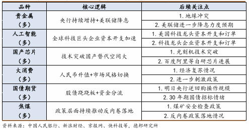 商品方面,貴金屬和有色金屬因全球流動性的寬鬆,漲價或將更流暢,值得長期佈局。工業品方面,反內卷逐漸進入深水區,當前時間點更多的行情來自於供給端博弈,板塊受政策預期波動或將放大,建議積極跟隨政策落地節奏。