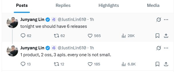 同時,阿里Qwen團隊的負責人透露,阿里Qwen團隊今晚要發佈6個“新東西”,1個產品,2個開源模型,3個API接口。