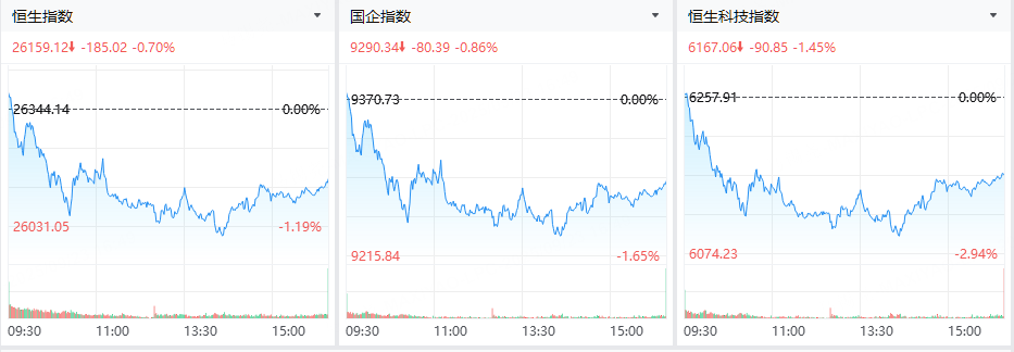 9月23日(週二),港股三大指數集體收跌,香港恒生指數下跌185.02點,跌幅0.7%,報26159.12點;香港恒生科技指數下跌90.85點,跌幅1.45%,報6167.06點;國企指數下跌80.39點,跌幅0.86%,報9290.34點。