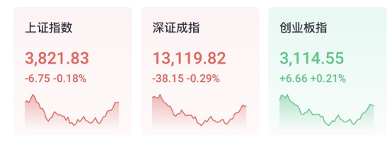 A股三大指數今日早盤集體下挫,尾盤收窄跌幅;截至收盤,滬指跌0.18%報3821點,盤中一度跌破3800點,深證成指跌0.29%,創業板指漲0.21%。全天成交額2.52萬億元,較前一交易日增量3760億元。