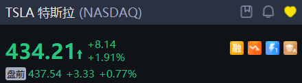 特斯拉 盤前小幅續漲,昨日盤中漲超4%,創年內新高。