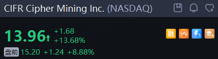 比特幣“礦企”普遍上行, Cipher Mining Inc. 漲近9%, Bitdeer Technologies Group 、IREN Ltd 漲超3%。