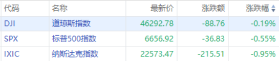 美股三大指數集體收跌,道指跌0.19%,納指跌0.95%,標普500指數跌0.55%,大型科技股普遍下跌,甲骨文跌超4%,亞馬遜跌超3%,英偉達跌超2%,微軟跌超1%。加密貨幣概念股跌幅居前,Circle跌超4%,Coinbase跌超3%。