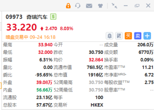 華盛資訊9月24日訊,中國第二大自主品牌車企奇瑞汽車正在暗盤交易,截至發稿漲8.03%,報33.22港元/股,中籤一手賬面浮盈247港元,最新總市值超1900億港元。該股預計將於9月25日正式掛牌上市,配售結果將於今日晚間披露。