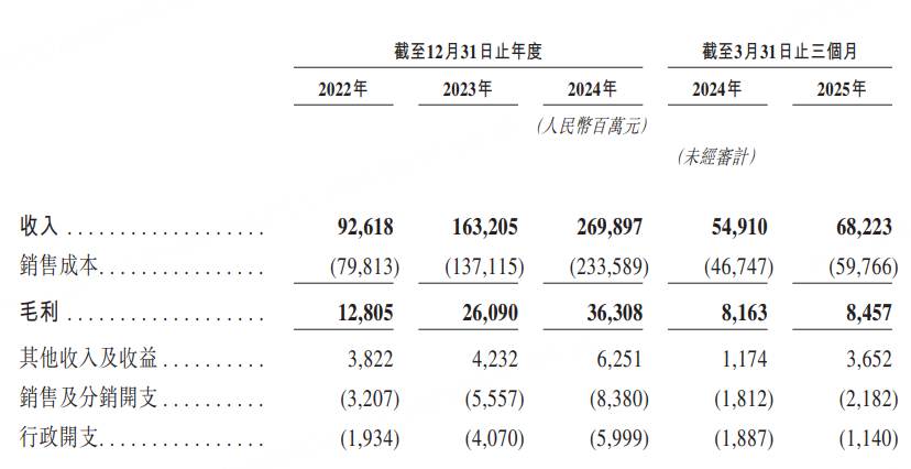 公司收入由2022年的人民幣926.18億元增加至2023年的人民幣1632.05億元,並進一步增加至2024年的人民幣2698.97億元。公司收入由截至2024年3月31日止三個月的人民幣549.1億元增加至截至2025年3月31日止三個月的人民幣682.23億元。公司年內利潤由2022年的人民幣58.06億元增加至2023年的人民幣104.44億元,並進一步增加至2024年的人民幣143.34億元。公司期內利潤由截至2024年3月31日止三個月的人民幣24.76億元增加至截至2025年3月31日止3個月的人民幣47.26億元。