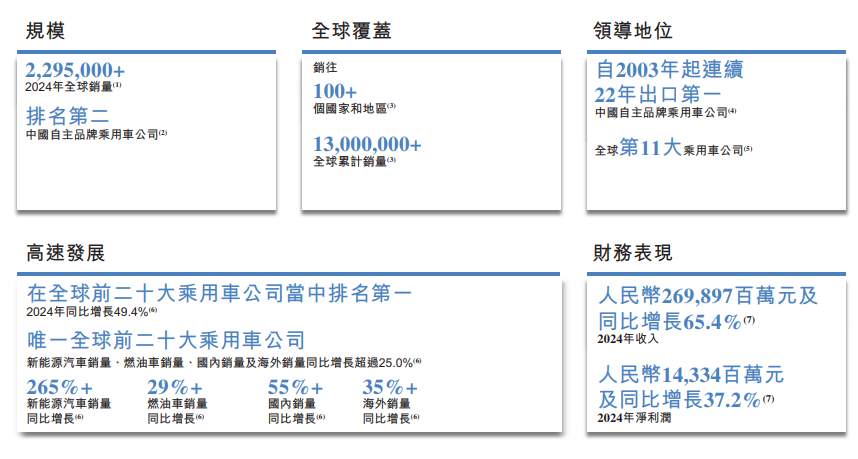 公司是一家乘用車公司,總部位於中國蕪湖。公司設計、開發、製造和銷售多樣化且不斷擴展的乘用車產品組合,包括燃油車和新能源汽車,滿足國內外市場用戶的不同及不斷變化的需求和喜好。自1997年成立以來,公司致力於引領行業創新和深耕國際市場,爲全球用戶提供高品質的乘用車。根據弗若斯特沙利文的資料,以2024年的全球乘用車銷量計算,是中國第二大自主品牌乘用車公司和全球第十一大乘用車公司。
