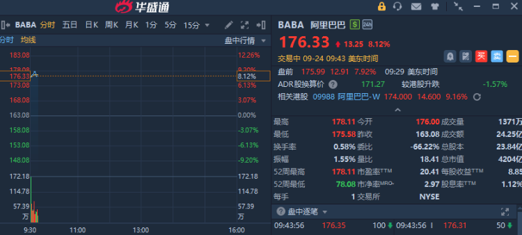 華盛資訊9月24日消息,熱門中概股開盤集體走強,受3800億基建+英偉達合作消息提振,阿里巴巴漲超8%。