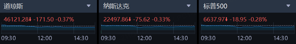 美東時間週三,三大指數集體收跌,人工智能(AI)龍頭股英偉達和甲骨文連續第二天承壓。截至收盤,道瓊斯指數跌0.37%,報46121.28點;標普500指數跌0.28%,報6637.97點;納斯達克指數跌0.33%,報22497.86點。
