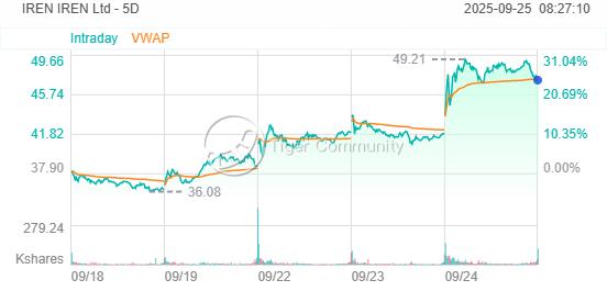 IREN的飛速崛起已引起散戶投資者的廣泛關注。在Stocktwits等平臺上,過去一個月該股相關消息量激增431%,情緒堅定處於"看漲"區域。9月24日,該股代碼位列前五大熱門股票代碼之一,吸引了廣泛散戶交易者的關注,他們渴望參與公司的轉型故事。