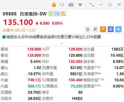 華盛資訊9月25日訊,百度集團-SW(9888.HK)拉昇漲超5%,報135.1港元;百度集團年內累漲63%。