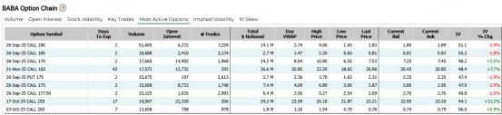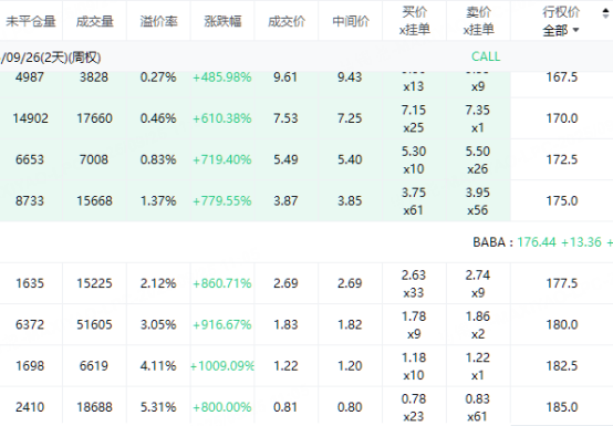 阿里大漲超8%,期權合約成交較90日平均暴漲3倍達688,035張。其中明日到期的180美元看漲期權交易量較高,共有51,605份合約交易。