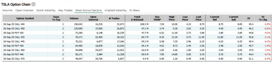 昨日,特斯拉大漲近4%,期權合約成交量大幅增長50%至252.37萬張。其中明日到期的440美元看漲期權交易量較高,共有150,643份合約交易。