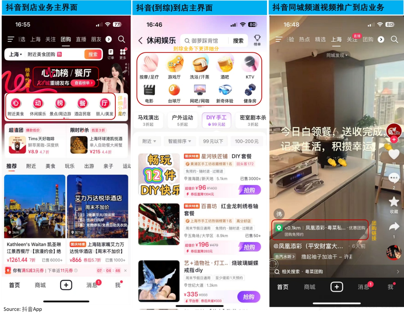 相比之下,抖音切入本地生活早期時,則更多是藉助其優勢所在的短視頻和直播。消費者隨機刷到介紹餐廳或者到綜商家的視頻,產生興趣再通過視頻附帶的鏈接參看進一步的信息或購買團購券。
