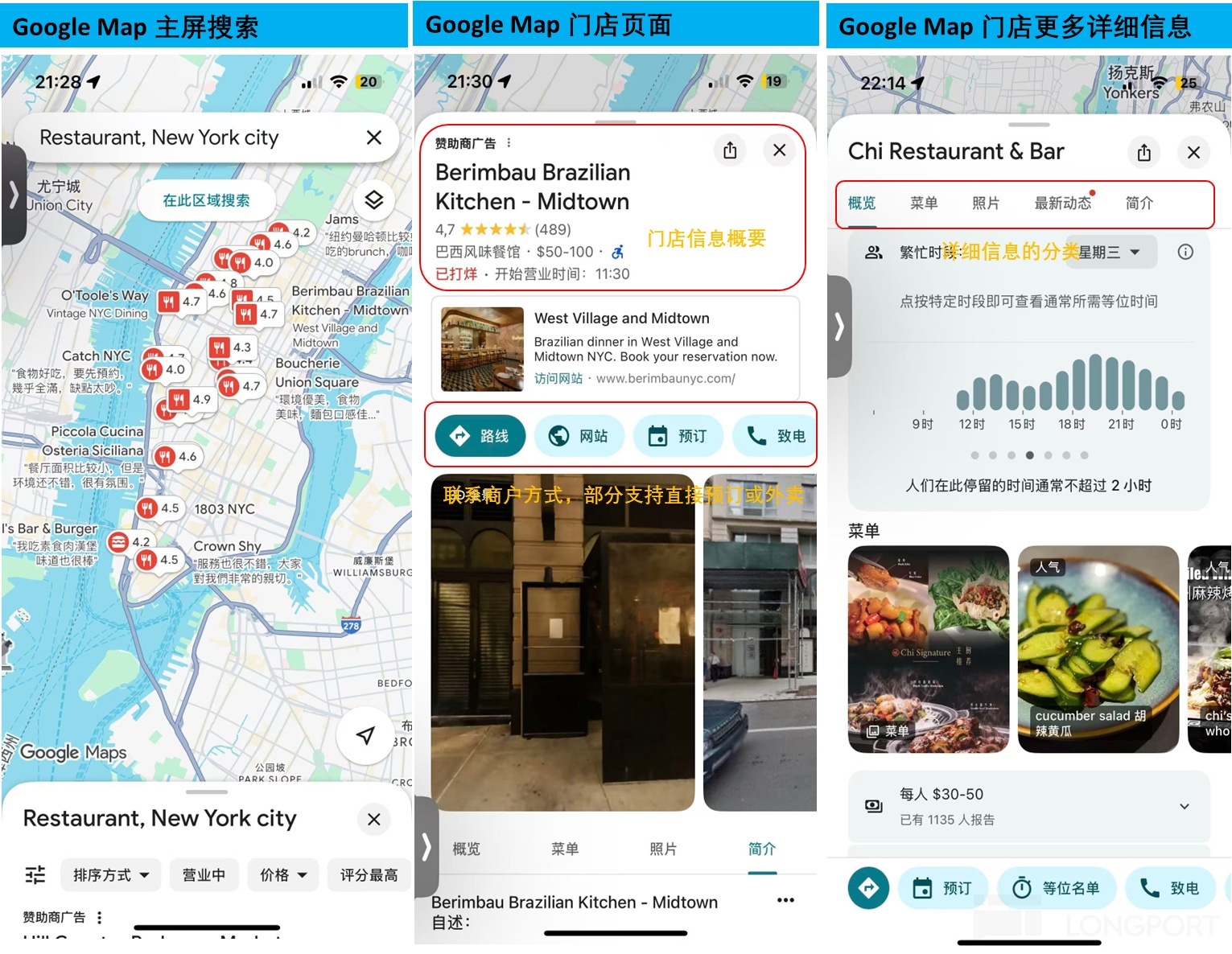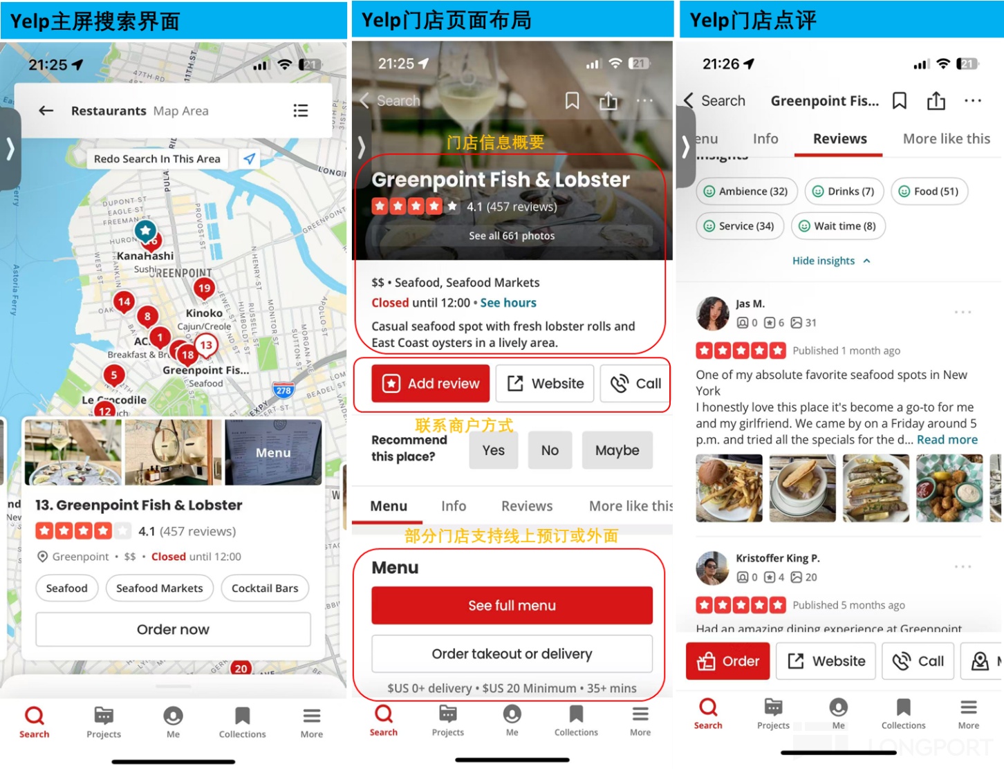 首先從產品角度,海豚在下圖中分別展示了 Yelp 和 Google Map 各自在到店信息分發上的頁面佈局和內容情況。概括來看,除了配色及佈局上的一些細微差異外,Yelp 和 Google Map 兩者之間,在 “人找店” 的推薦邏輯和信息的展示形式上幾乎是一模一樣的。