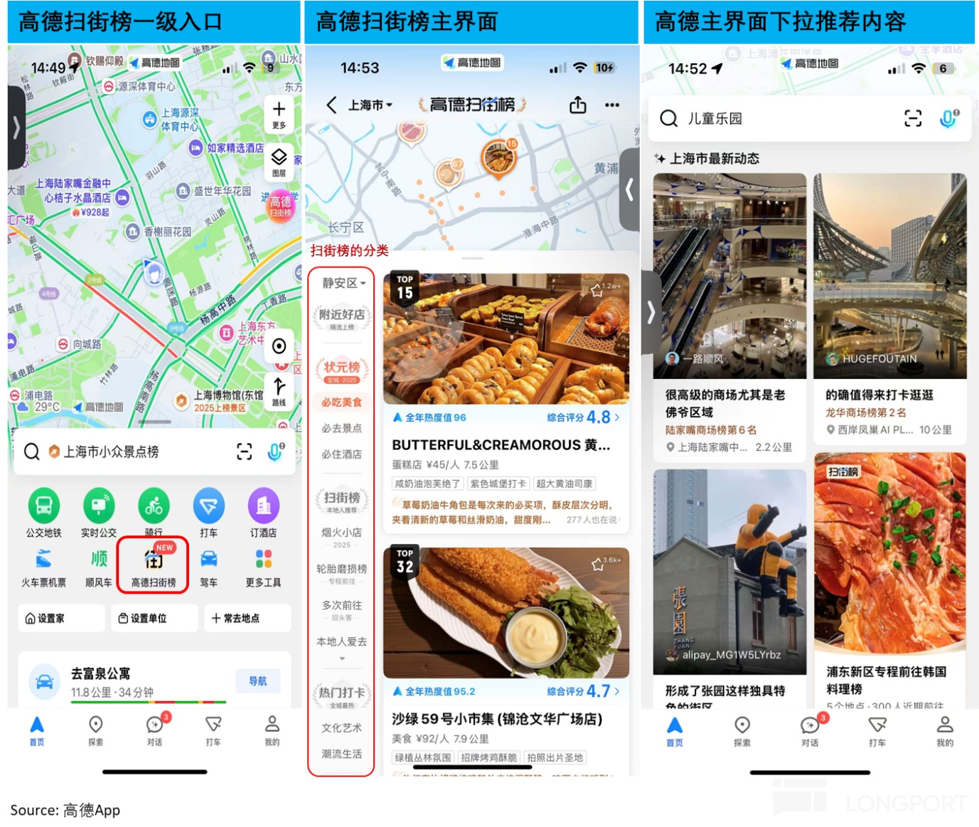 從高德、美團和抖音三個平臺各自的特點看,抖音屬於典型的 “店找人”+ 介入節點相對靠前(種草階段);美團則屬於 “人找店”+ 介入節點相對靠後(臨近消費);而高德掃街榜目前來看處於前兩者的中間位置,屬於更偏 “店找人”+ 介入節點也相對靠後。