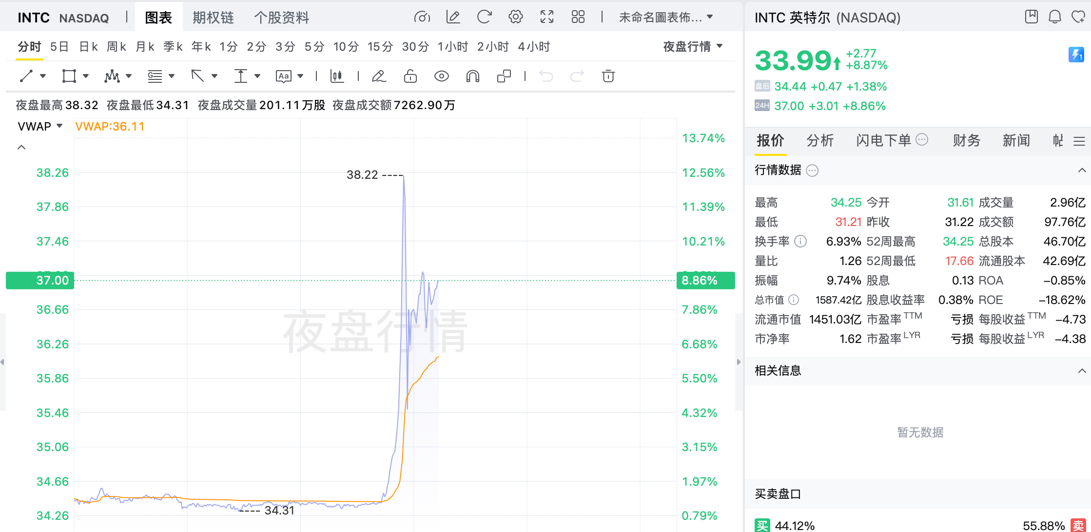 英特爾美股夜盤一度拉昇超12%,現漲超8%。據華爾街日報,特朗普政府擬限制海外芯片進口。