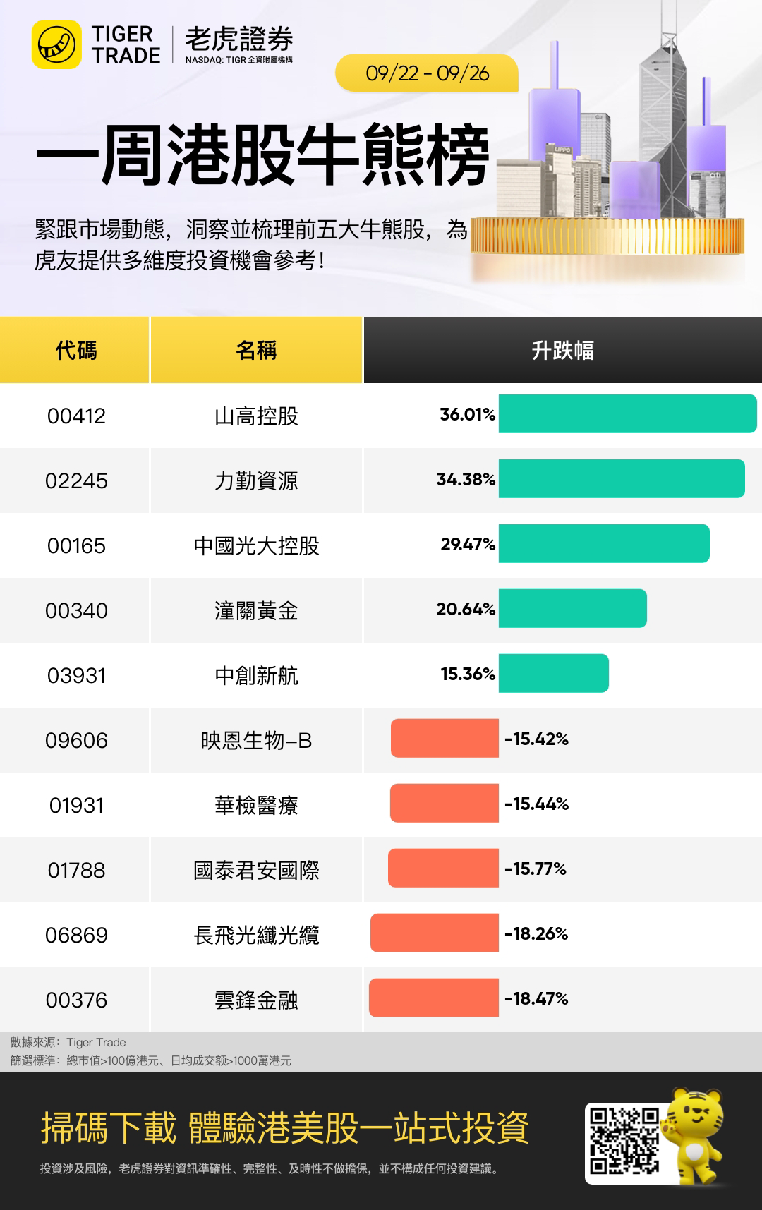 本週市值百億以上、日均成交千萬以上表現最好五隻股票是 山高控股 、 力勤資源 、 中國光大控股 、 潼關黃金 、 中創新航 ;