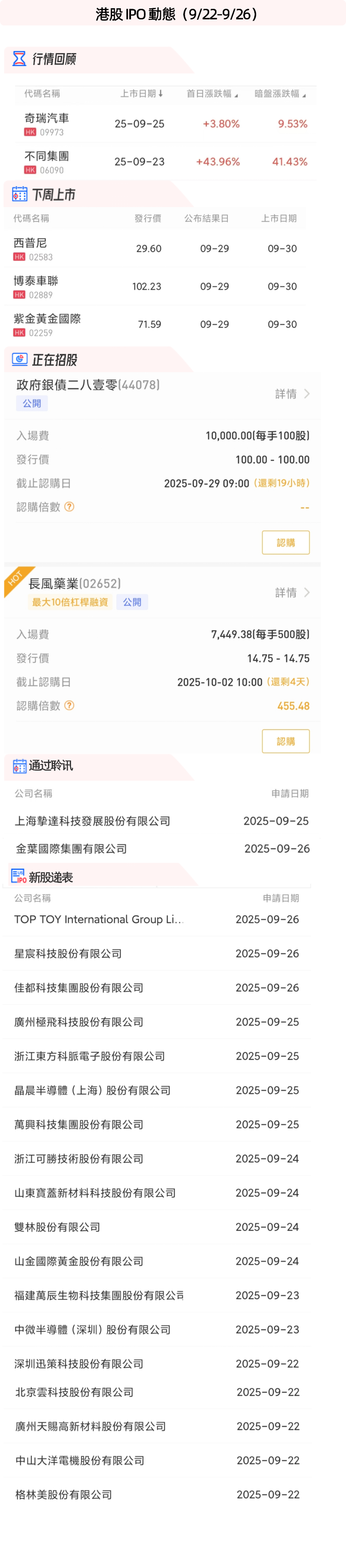 目前,長風藥業正在火熱招股中;博泰車聯、紫金黃金國際和西普尼三家公司已結束招股,點擊前往新股中心>>這三家公司將於下週掛牌上市,已認購投資者留意中籤結果。
