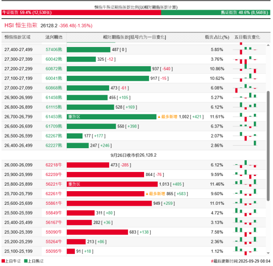 過去5日,恒指牛證合計約1.24億港元資金淨流出套現;恒指熊證則合計約1834萬港元資金淨流入。街貨分佈方面,至上週五,恒指牛證街貨佔比約59.4%,分佈在收回價25600點至26100點之間,累計相當約4164張期指合約;恒指熊證街貨在收回價26400點至26900點之間,累計相當約2504張期指合約。