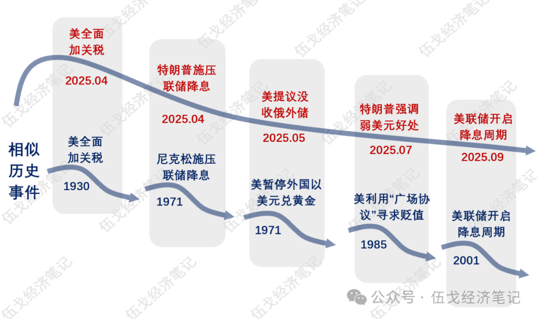 耐人尋味的是,近期以股票爲代表的風險資產和以黃金爲主的避險資產同步上漲,歷史上這往往對應着美元的貶值階段。除了傳統週期性因素之外,市場對於關稅的徵收、聯儲的獨立性、匯兌的安全性等擔憂,或都指向本輪美元的調整將是結構性且深遠的。
