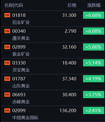 黃金股普漲,多股創歷史新高,招金礦業、潼關黃金漲超6%,紫金礦業、靈寶黃金漲超5%,山東黃金漲超4%,赤峯黃金漲超3%;