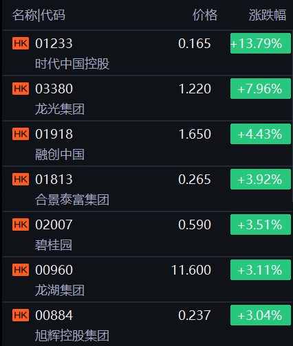 內房股多數上漲,時代中國控股漲超13%,龍光集團漲近8%,融創中國漲超4%,碧桂園、龍湖集團漲超3%;