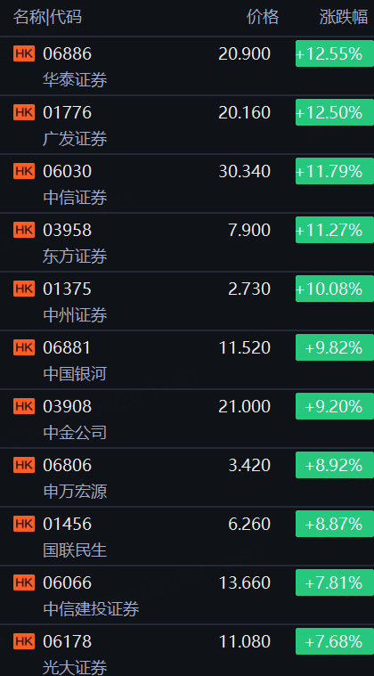 中資券商股漲幅明顯,華泰證券、廣發證券大漲12.5%領銜,中信證券大漲近12%,中國銀河、中金公司均大漲超9%;