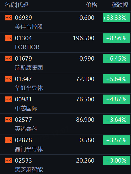 半導體板塊延續強勢,FORTIOR漲超8%,華虹半導體漲超5%再創歷史新高,中芯國際漲超4%。