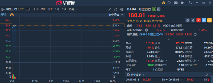 華盛資訊9月29日消息,熱門中概股集體拉昇!阿里巴巴大漲超5%,此前獲摩根士丹利看多。