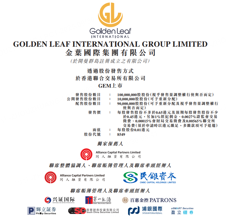 9月29日,金葉國際集團於9月30日-10月6日招股,擬發售1億股,公開發售佔10%,配售佔90%。發售價將爲每股發售股份0.45-0.65港元,每手5000股,預期將於10月10日開始在聯交所買賣。