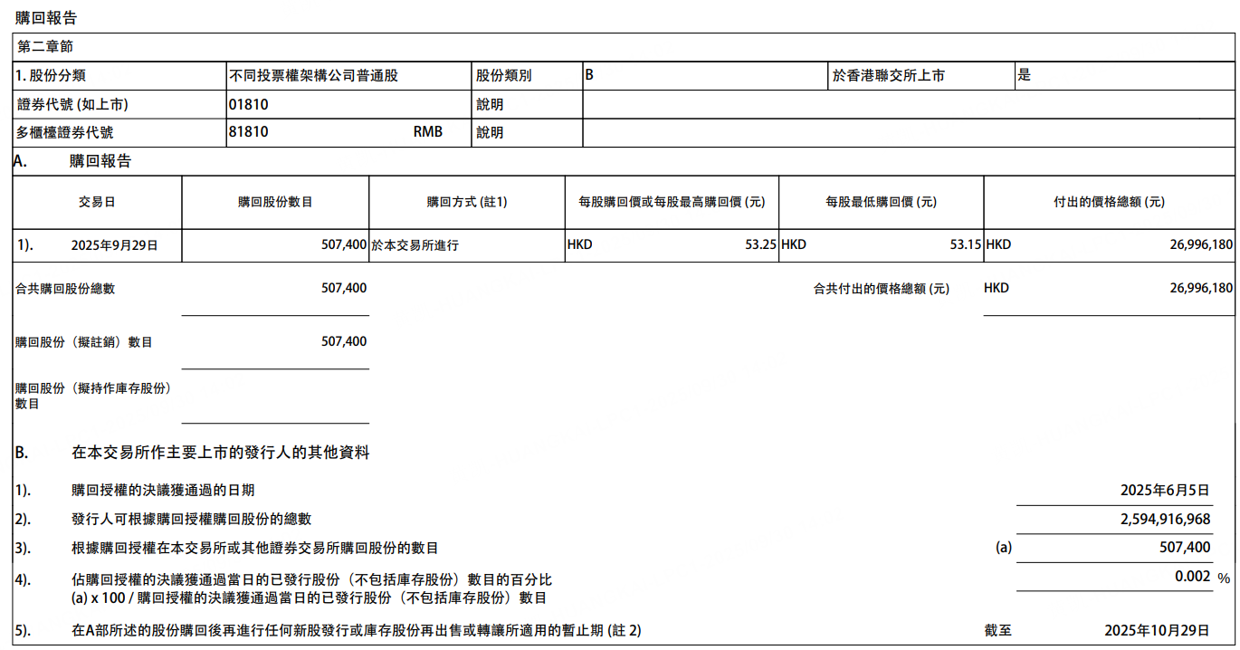 小米集團-W於9月29日在港交所發佈公告,公司以每股53.150港元至53.250港元的價格回購50.74萬股,回購總金額達2699.62萬港元。