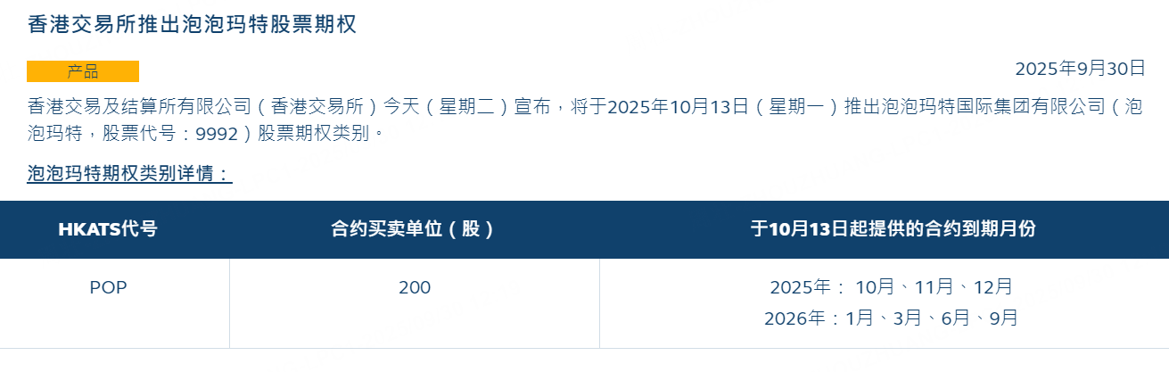 9月30日,香港交易所今天宣佈,將於2025年10月13日(星期一)推出泡泡瑪特國際集團有限公司(泡泡瑪特,股票代號:9992)股票期權類別。