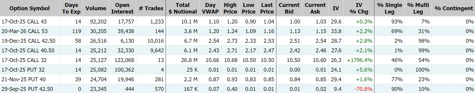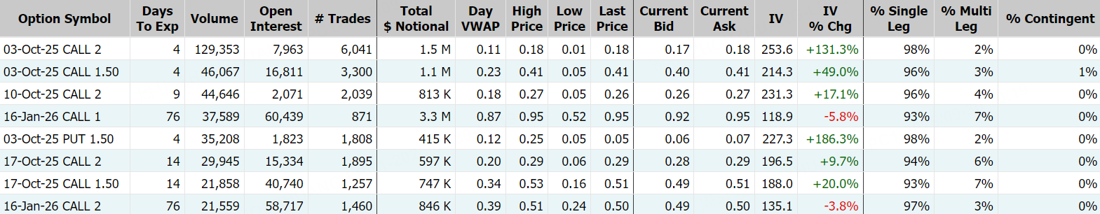 期權方面,Tilray當日期權成交近67萬張,較90日均量放大11倍,看漲期權佔比88%,其中於10月3日到期的2美元行使價的看漲期權成交居前,成交近13萬張。 $TLRY 20251003 2.0 CALL$