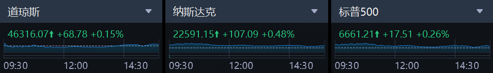 美東時間週一,美股三大指數集體上漲。截至收盤,道瓊斯指數漲0.15%,報46316.07點;納斯達克綜合指數漲0.48%,報22591.15點;標普500指數漲0.26%,報6661.21點。