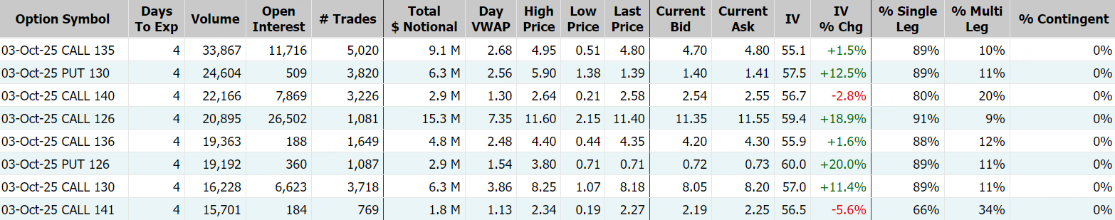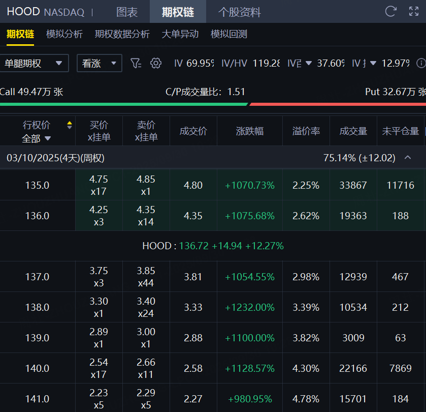 期權方面,Robinhood當日期權成交82.13萬張,環比前一交易日增加逾67%,看漲期權佔比60%,其中於10月3日到期的135美元行使價的看漲期權成交居前,成交近3.4萬張。此外,從期權鏈上看,Robinhood多張Call單大漲逾1000%。