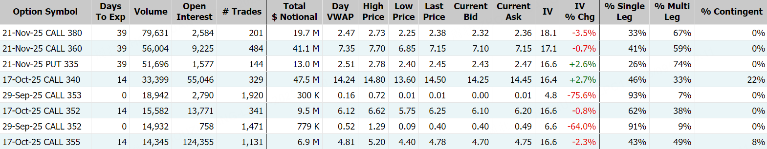SPDR黃金ETF當日期權成交83.97萬張,較90日均量放大逾2倍,看漲期權佔比攀升至62.6%,其中於11月21日到期的380美元行使價的看漲期權成交居前,成交近8萬張。 $GLD 20251121 380.0 CALL$