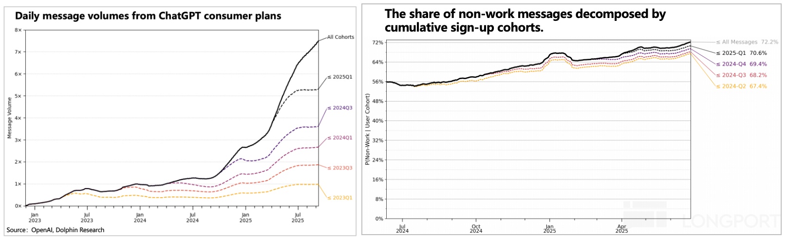 當然,OpenAI 能夠產生影響的關鍵,在於其目前巨量的用戶規模和交互粘性。目前周均 7 億的用戶,每日交互量數倍增長,其中非工作相關的交互量從去年 7 月的 56% 上升到 72%。越晚註冊(1Q25)的用戶,交互頻率越高,且越與工作無關。這裏體現到 ChatGPT 的破圈效應,已經從工作流的核心用戶,拓展到普通用戶圈層。