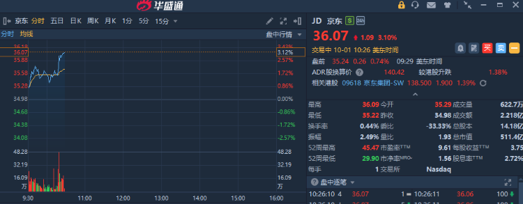 華盛資訊10月1日消息,熱門中概股漲跌不一,京東漲超3%,拼多多、百度漲超1%,阿里巴巴漲約0.7%。