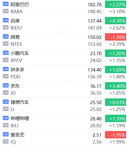 10月2日,部分明星中概股夜盤上漲,阿里巴巴漲超3%,百度、網易漲超2%,拼多多、京東、小鵬汽車、理想汽車等均漲超1%。