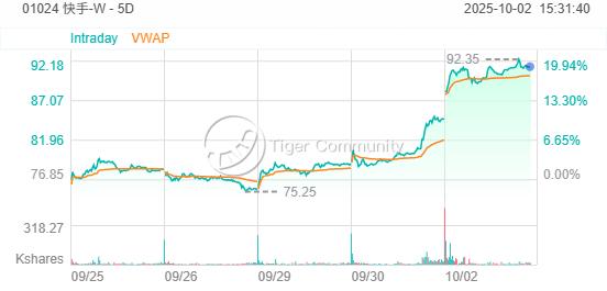 快手週四(2日)飆8%,高見92.6,成交62億港元。