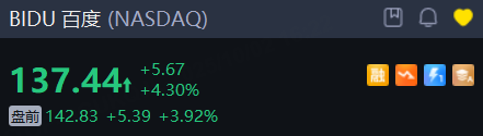 明星中概股盤前集體走高,百度漲近4%,金山雲、世紀互聯漲超3%,阿里巴巴漲2.9%,嗶哩嗶哩、蔚來、理想汽車、小鵬汽車漲超2%,京東漲1.8%。