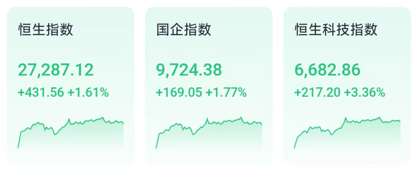 10月2日週四,港股取得10月及第四季度開門紅。截至收盤,恒指收漲1.61%報28287.12點,創2021年7月以來新高;恒生科技指數收漲3.36%,國企指數收漲1.77%。