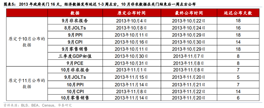 除就業市場外,政府關門還對美國經濟增長產生直接拖累,且進一步加劇了核心經濟數據發佈的不確定性。按照原計劃,本應在10月3日發佈的非農就業數據、10月15日發佈的消費者價格指數(CPI)等關鍵經濟指標,目前已確定因停擺延遲。據華泰證券援引信息顯示,美國勞工統計局(BLS)已明確表態,在政府關門期間將全面暫停數據收集與發佈工作,這意味着一系列由政府主導的經濟數據(如PPI、零售銷售、GDP等)均將面臨延遲發佈風險。回顧2013年美國政府16天關門事件,當時10月計劃公佈的9月非農就業、CPI/PPI、零售銷售、三季度GDP初值、個人消費支出(PCE)等數據均延遲1-3周發佈,即便到11月公佈10月數據時,延遲時間仍達1-2周,此次停擺若持續,或會重演類似的數據披露混亂。