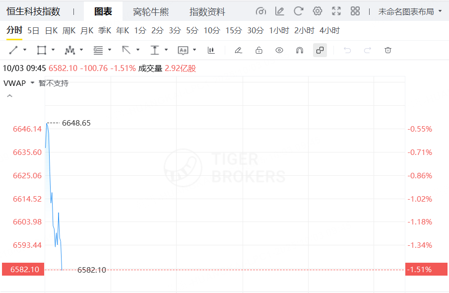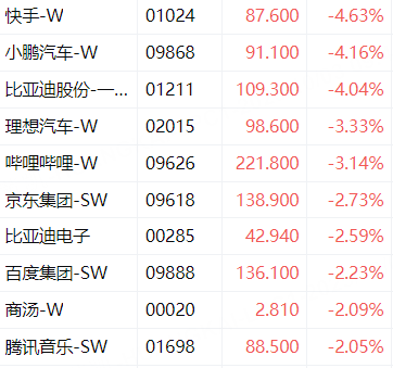 10月3日,恒生科技指數盤初跌幅擴大至1.5%,成分股中,快手-W、小鵬汽車-W、比亞迪股份跌超4%,理想汽車-W、嗶哩嗶哩-W跌超3%。