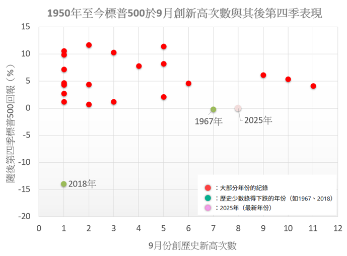 根據統計,自1950年至今,標普500僅有23次能在9月份創下歷史新高,其中大部分情況下的創新高次數都不超過5次,而今年卻錄得8次,顯示出市場的異常強勢(圖)。進一步觀察歷史數據可見,在此前22次出現“9月創新高”的情境下,標普500於第四季錄得升幅的機率高達逾九成(20次上漲、僅2次下跌)。平均升幅達4.8%,中位數則爲4.7%。至於唯二的下跌案例,分別發生於1967年(微跌0.2%)及2018年(大跌14%),均屬特殊年份背景所致。