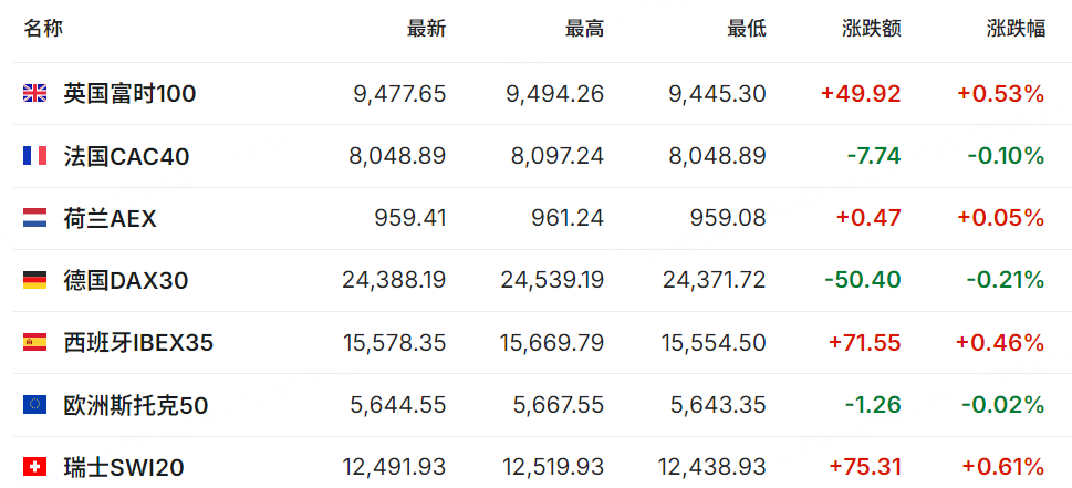 歐洲主要股指漲跌各異,截至發稿,英國富時100漲0.53%,法國CAC40跌0.1%,德國DAX30指數跌0.21%。